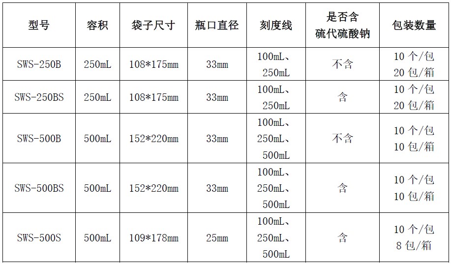 用于水樣的無(wú)菌采集,取代傳統(tǒng)需高壓滅菌、洗漱、烘干等步驟的玻璃采樣瓶。經(jīng)過(guò)輻照滅菌處理,即需即用。有250mL、500mL、含硫代硫酸鈉、不含硫代硫酸鈉等多種規(guī)格。含硫代硫酸鈉的無(wú)菌取水袋,可用于水中余氯的中和,無(wú)需另外添加。滿足生活飲用水、環(huán)境水、等多場(chǎng)景的微生物污染指標(biāo)檢測(cè)。